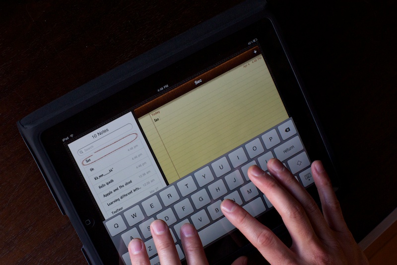 If the screen's viewing angle is straight to your face, your wrists are breaking at an awkward angle to type on the screen. If you flatten the surface like a keyboard, the screen—already reduced in practical display real estate—starts to be obscured by your hands. Pushing the device away and at a slight angle—perhaps by using the wedge shaped case that Apple sells, is the best course of action. But if the best way to type on the touchscreen requires a sort of kickstand, maybe the iPad should have had a kickstand? I'll leave that to the industrial design test note section. You make some errors, but man oh man can you type fast! As fast as you can on a touch keyboard, with some errors that are caught by the auto correcting algorithms and some that require you to type the word over again.