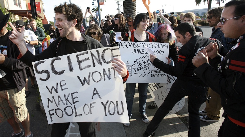 Sure, easy for him to say! What about poor Robert Fitzpatrick, the former MTA employee we told you about earlier, who spent his savings on doomsday subway ads and billboards. Here's video of him being accosted by an angry mob in Times Square. Downside: No apocalypse. Upside: Jersey Boys is half-off at the TKTS booth! [sfgate, video via Daily What]