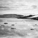 Amphibious craft at Broad Beach, Kiska, August 1943. Aerial view of amphibious craft on the beach and approaching from ocean; sandy. landing spit is between West Kiska Lake and Bering Sea.