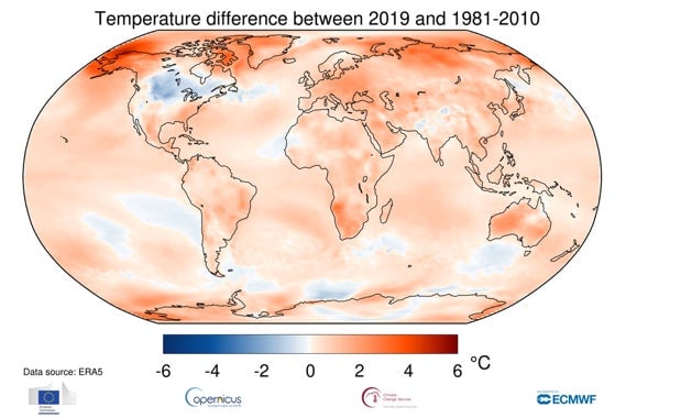 The annual average temperature for 2019 was 0.6 degrees Celsius (1.08 degrees Fahrenheit) higher than the average between 1981 to 2010. That puts 2019 only 0.04 degrees Celsius (0.072 degrees Fahrenheit) cooler than 2016, the hottest year on record. All told, the last five years were the five warmest on record. That heat is one of the most telltale signs of the impact carbon pollution is having on our planet.