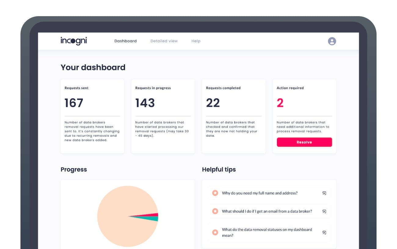 Incogni removes your personal information from broker databases, works hard to protect it going forward, and handles all the sensitive interactions with them you may be overwhelmed by, from follow-up communication to fighting rejected claims. We help users eliminate their data in a fraction of the time it would take to do it manually, then monitor the internet to prevent it from ending up back online.