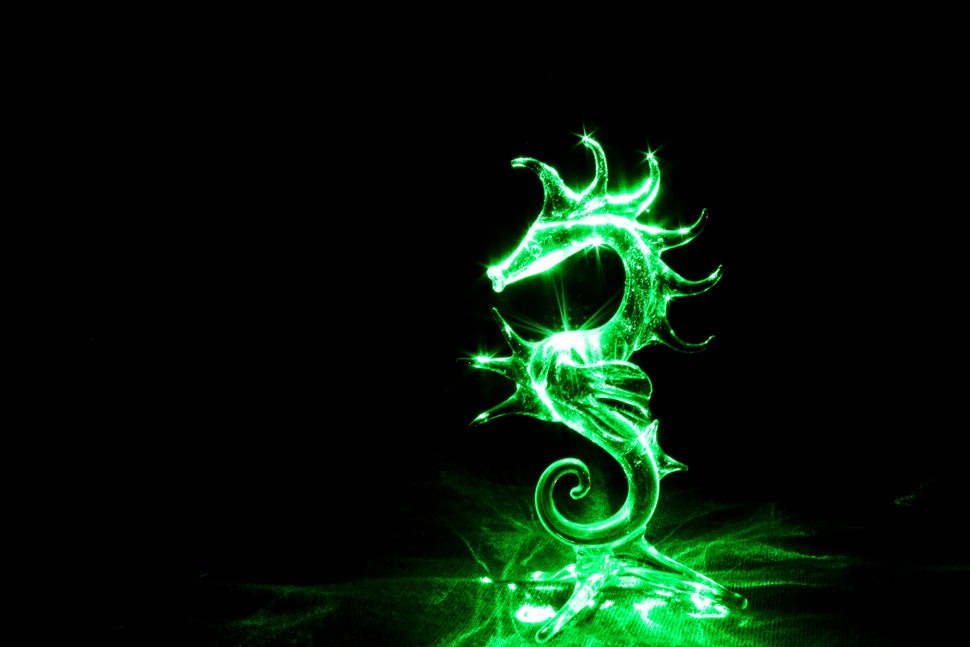 For inspiration, I dug up my green laser and walked around my house pointing it at anything reflective or glass. Finding this glass figurine (originally from Amboise, France), I used the laser to light him up. The longer shutter speed (8 seconds for example) lit it too evenly, so the faster shutter with tighter aperture worked better. You can see the laser on the ground below the base of the figure! Canon T2i, 3″2, f/20, ISO 1600, kit lens (18-55) @ 24mm.