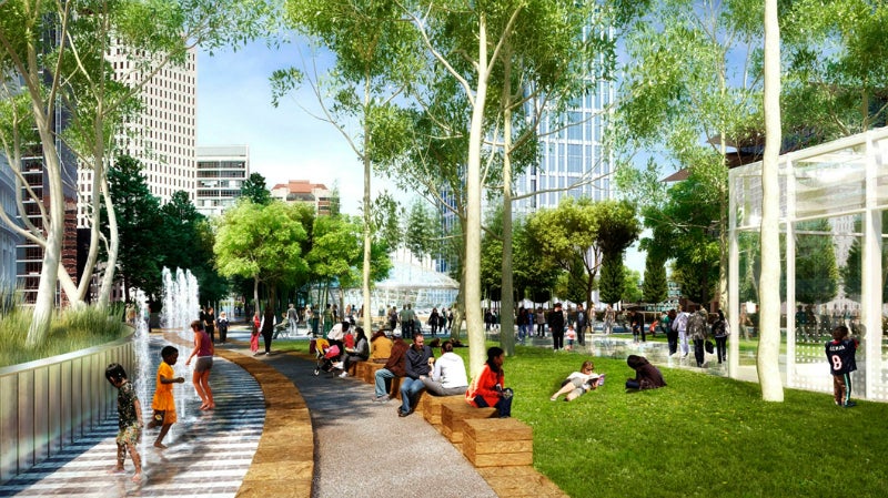 San Francisco’s massive Transbay Center will include a park, walking trail, retail, lily pond, and outdoor amphitheater. Oh yeah, and you can catch your train, too. Credit: Transbay Center