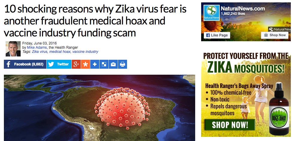 As we explored last week, websites like Natural News accuse the Centers for Disease Control of planning a global conspiracy around Zika. Writers like Mike “The Health Ranger” Adams claim that chemicals and vaccines are the real cause of Zika virus—but he’d like you to buy his “chemical-free” bug spray anyways.