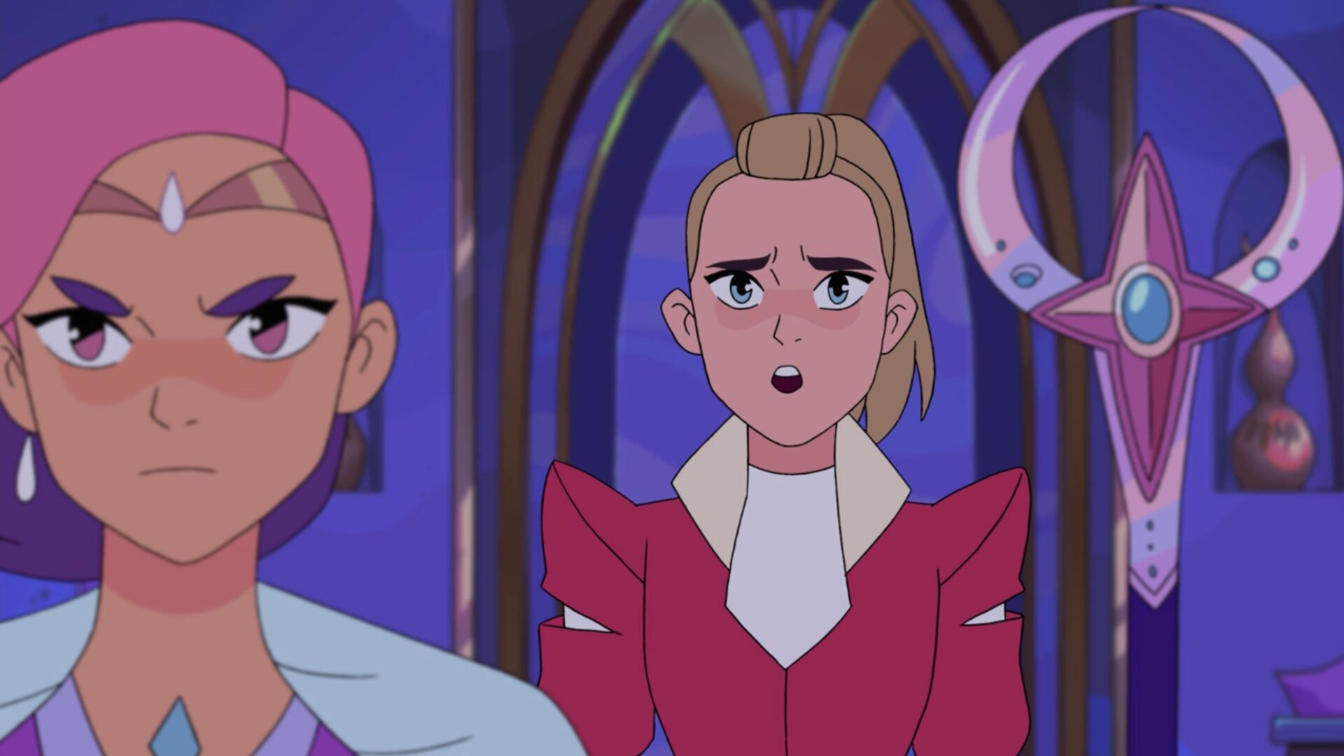 This isn’t helped by the fact that Adora keeps steamrolling Glimmer—not only by insisting on protecting her from any harm, as part of her promise to Queen Angella but also because she’s used to calling the shots in their relationship. She’s She-Ra, the chosen one, the decision-maker. Glimmer’s new position changes that dynamic and Adora has a hard time coming to terms with that. Plus, there’s the hard and uncomfortable truth that, deep down, Glimmer blames Adora for the loss of her mother. No amount of singing can fix that.