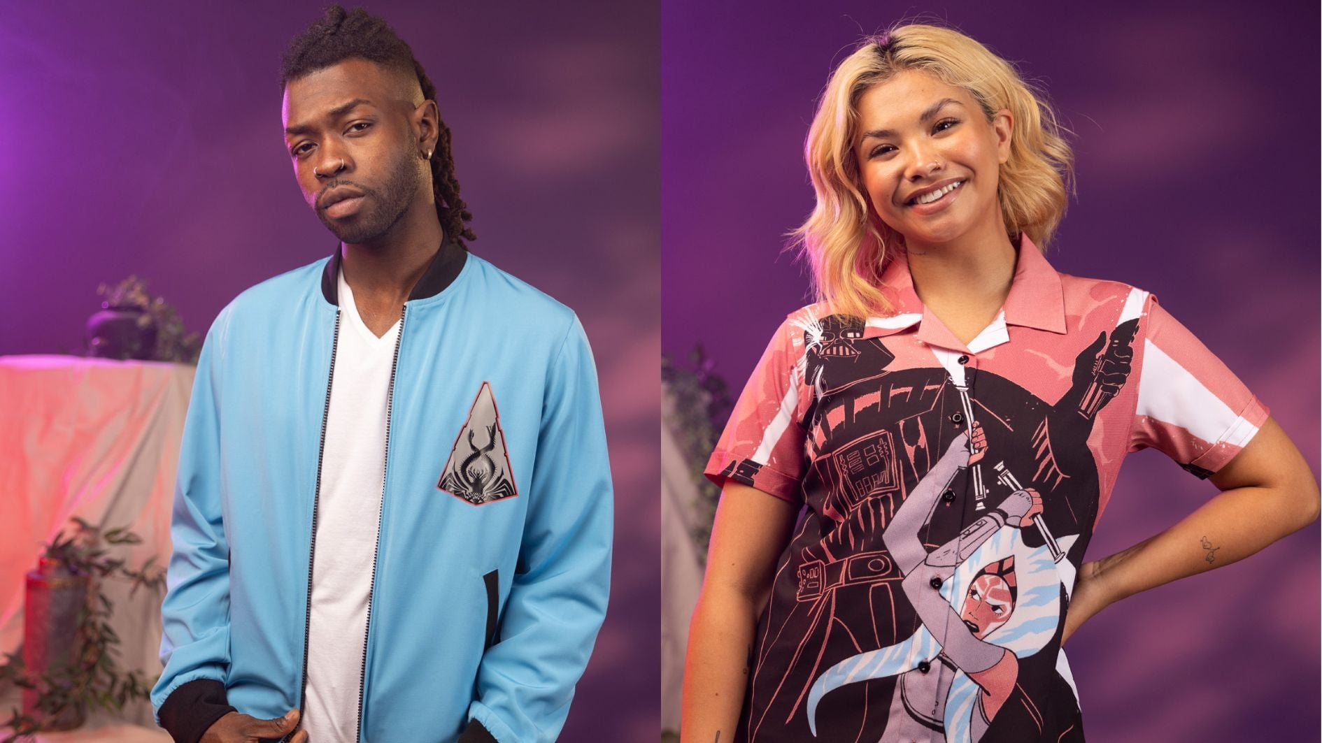 Designs span across the galaxy, of course, whether you’re an original Star Wars trilogy or prequel-era aficionado too. These end of summer looks celebrate iconic moments like Ahsoka vs. Vader as seen in Star Wars: Rebels (and we’re hoping in Ahsoka too), a Thrawn-inspired reversible bomber jacket, a Bo Katan button-up, and more favorite battles across the stars. And they’re fresh styles to keep cool in, with breathable fabric that come in unisex, women’s, and select kid’s cuts.