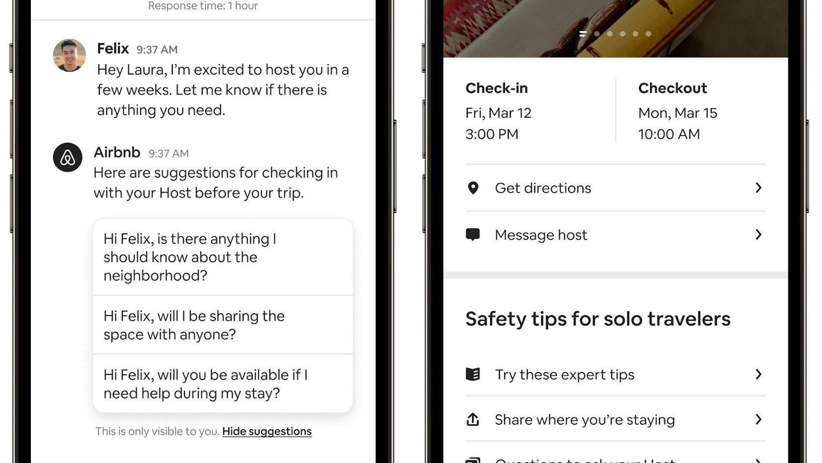 Airbnb also announced new app features on Monday for solo travelers. When booking, the app can send a trusted contact the location and itinerary for where you’re staying. For those who book as a solo guest, the app promotes a “one-touch” ability to share the date of check-in, check-out, and address of the property.
