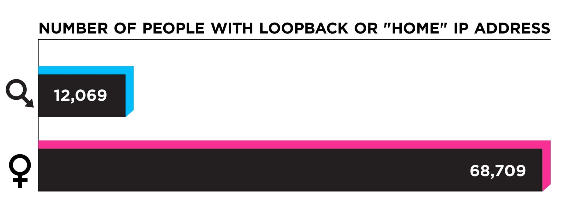 But the second most popular IP address, found in 80,805 profiles, was a different story. This IP address, 127.0.0.1, is well-known to anyone who works with computer systems as a loopback interface. To the rest of us, it’s known simply as “home,” your local computer. Any account with that IP address was likely created on a “home” computer at Ashley Madison. Interestingly, 68,709 of the profiles created with that IP address were female, and the remaining 12,000 were either male or had nothing in the gender field.