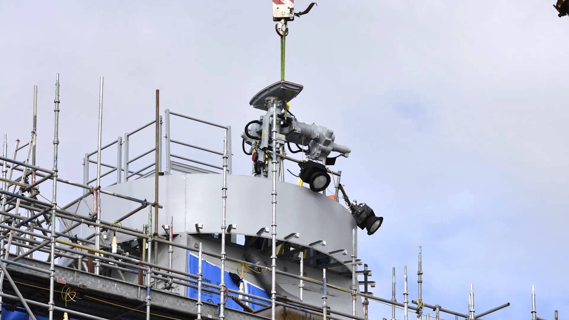 Cramming a full day’s work into one minute, the time lapse video below shows us how the British warship builders lifted the device (weighing 1543 pounds!) into place 100 feet above the flight deck.