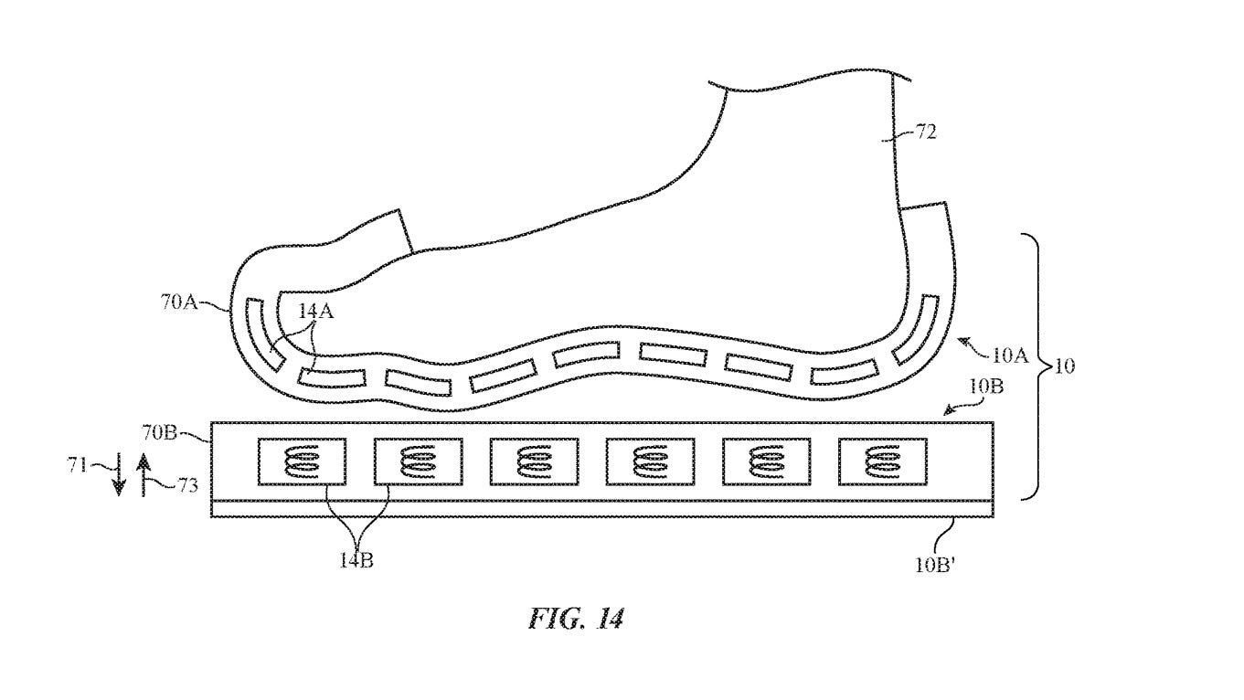 A new patent spotted by AppleInsider mainly describes a haptic output device that “may include foot-shaped structures with cavities configured to receive the feet of users.” The foot-wearable support structure would also feature an “array of haptic output components” that work to “apply feedback” to the bottom and top of a person’s foot, possibly to create a sense of movement even if the foot isn’t moving. “These forces may provide a user with a sensation of resting or sliding across a tiled surface or other surface with surface irregularities,” the patent reads.