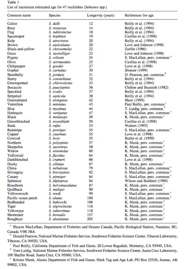 As for Olshansky’s point about failing to scale for time, Bar-Yam points to how crocodiles barely seem to age at all, and how some species of birds live for only several years, while others, like the albatross, live for nearly five decades. There are also rockfishes to consider; check out this chart showing the incredible variations in lifespan among its member species: