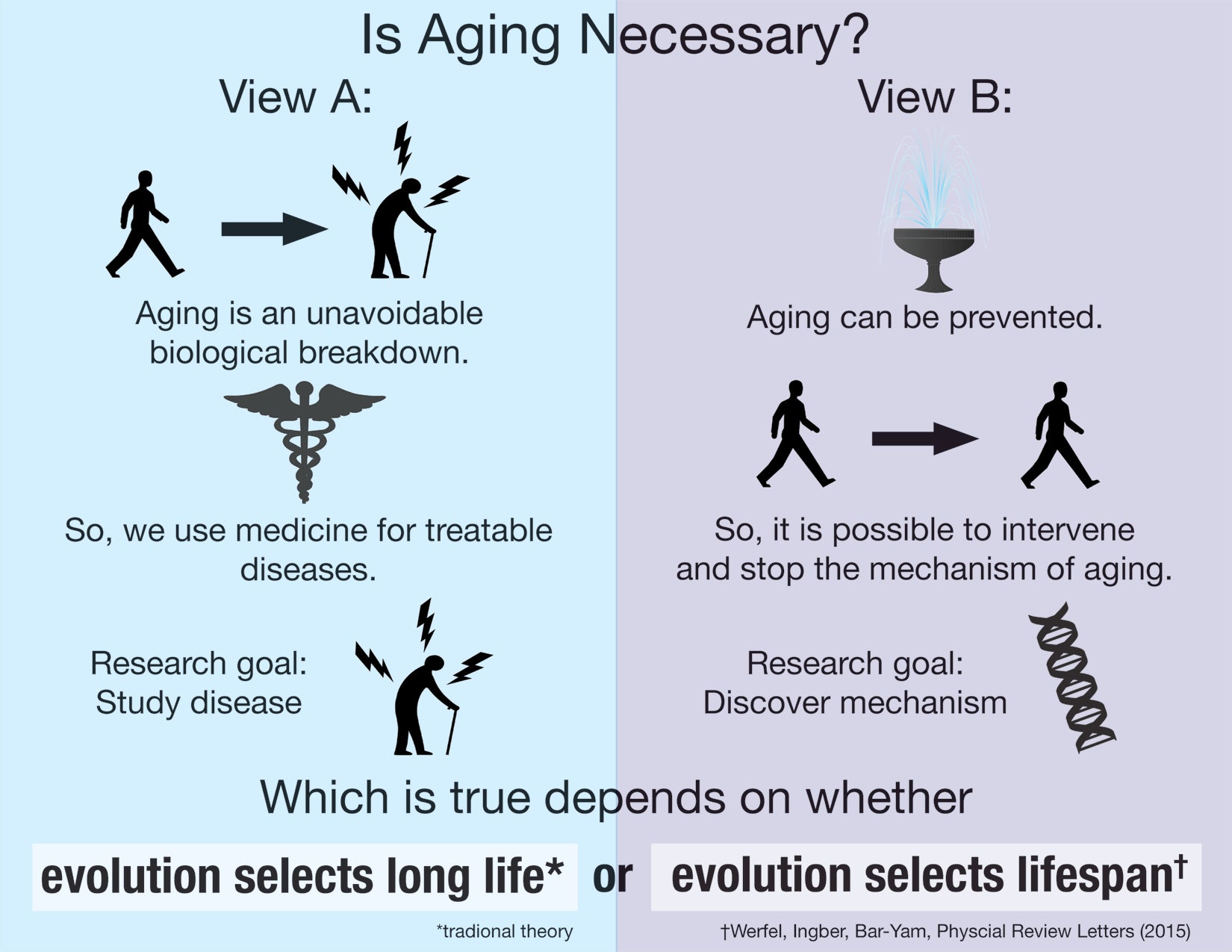 He says the answer from the traditional theory is not based upon any understanding of biology that tells us aging is necessary, “but it’s only and solely based upon solutions that are based on mathematical approximations.”