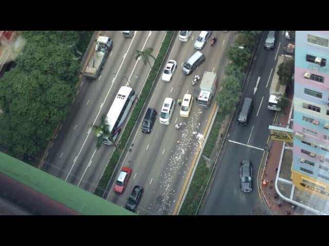 Dozens of Hong Kong motorists and pedestrians rushed to grab loads of money after an armored truck’s doors opened by accident on a busy road, spilling about 4.5 million US dollars in HK$500 notes (US$65) on Christmas Eve, reports the South China Morning Post. Check out all those frantic bastards.