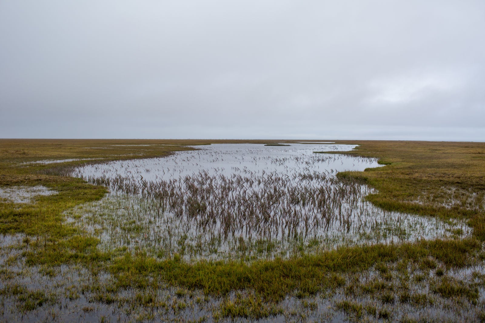 The week I visited, it was a drizzly 45 degrees, and charcoal clouds hung low in the sky. After meeting Cody at his lab, donning jackets and massive golashes, we headed for a mile-and-a-half hike out to Elson Lagoon, a strip of coastline protected by barrier islands on Utqiagvik’s eastern shore. The going was slow: The ground, a vast expanse of yellowing grasses and moss, was so deeply thawed in certain places that it felt like walking on a moon bounce. As the mist picked up and started to fog my glasses, I tried not to think about how easy it would be to get lost out here.