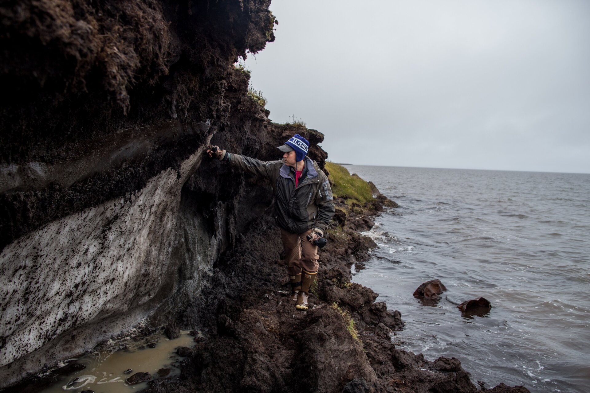 Eventually and without warning, the tundra gave way to a bluff overlooking a desolate shoreline. Taking care not to slip, we made our way down thick blocks of eroded soil to the water. As we stood looking back on the bluff, I got my first real glimpse of the ground I’d been hiking across, flying above, and talking with scientists about all week.