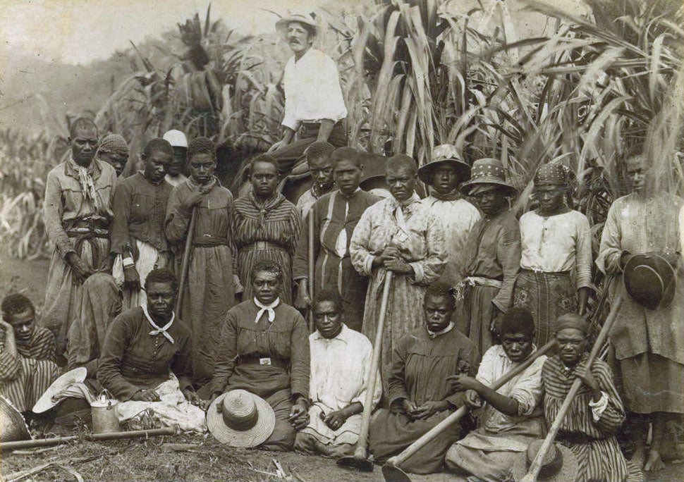 “Kanakas” on a sugar plantation in Cairns, Queensland circa 1890 via Britannica