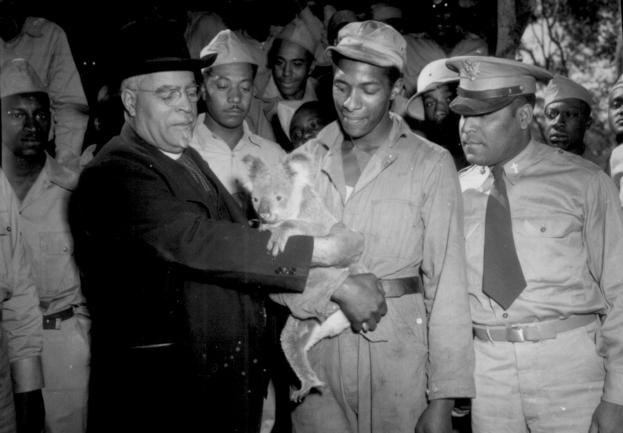 Bishop John Andrew Gregg, serving as part of President Roosevelt’s envoy, shown with black soldiers in Australia in 1943 (National Archive)