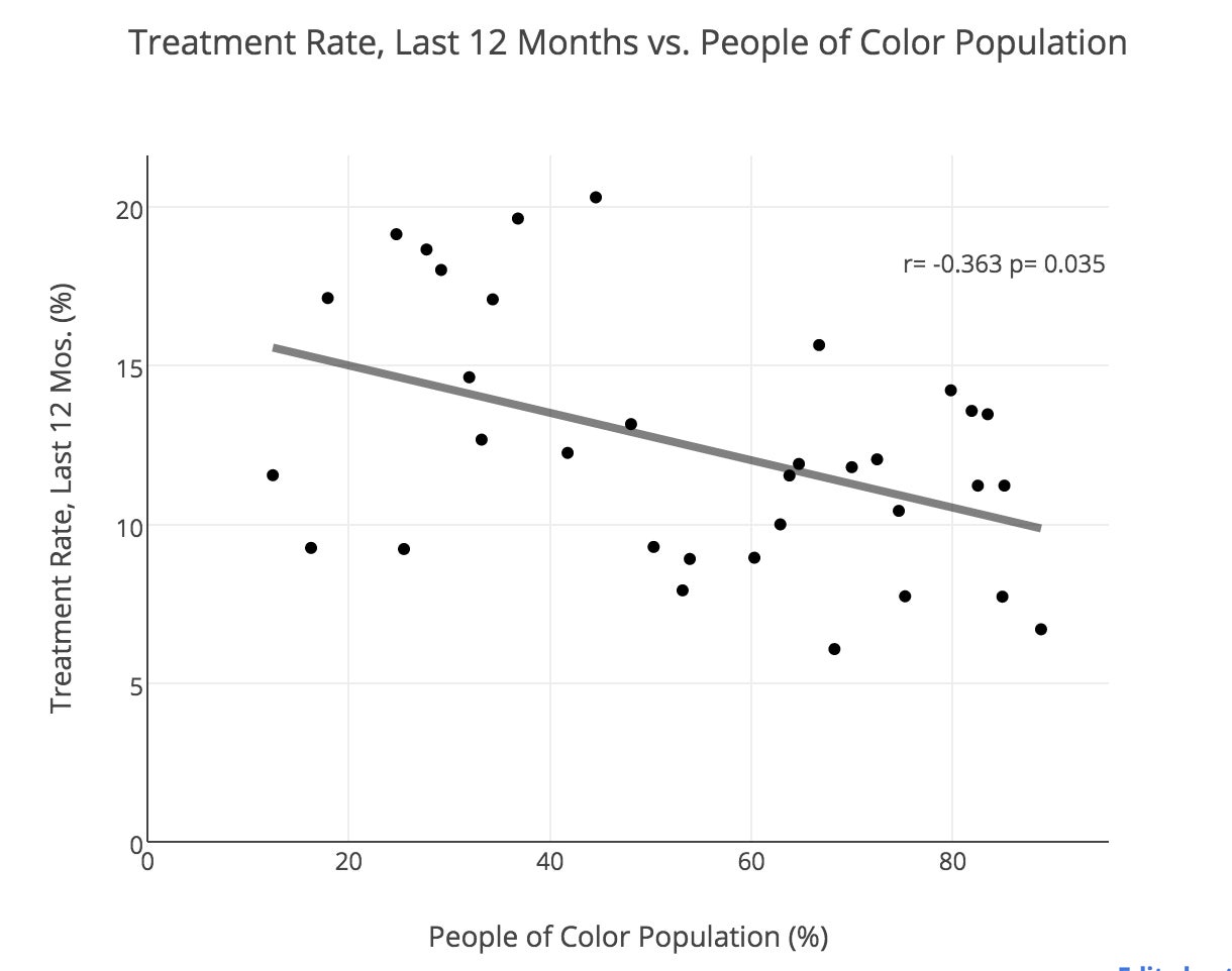 The chart below reveals what statisticians call a “significant” relationship between the percentage of people of color in a neighborhood and treatment rate for depression over a 12-month period (A p-value less than .05 denotes a significant relationship, meaning that there is only a small probability that whatever you’re testing happened by chance). As you can see, as the percentage of people of color rises, the rate of treatment decreases.