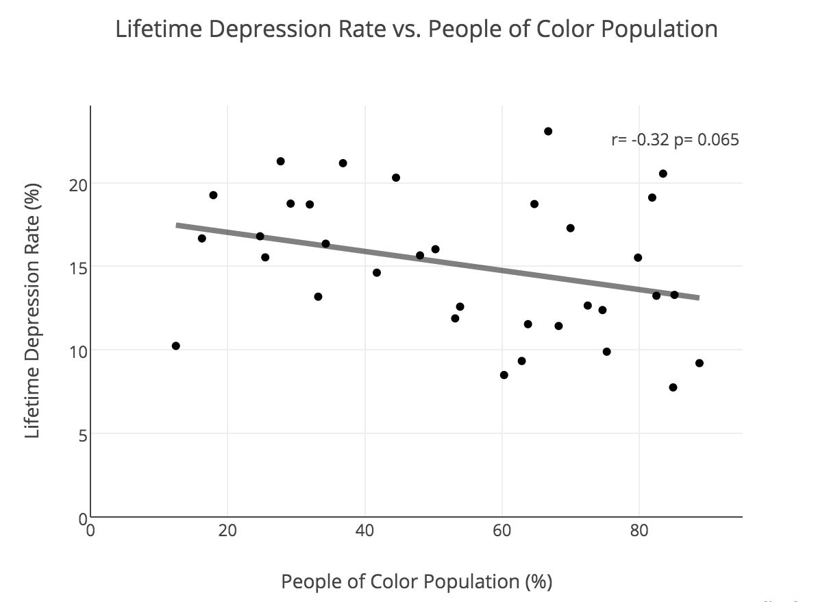 When comparing a neighborhood’s people of color percentage to its lifetime depression rate, the data doesn’t quite reach significance because the p-value of .065 is larger than .05, but there is a definite trend: neighborhoods with greater populations of people of color have lower lifetime depression rates. While an average of around 17 percent of people in the U.S. experience depression sometime during their lives, some of these neighborhoods with greater percentages of people of color, like Jamaica and Flatbush, have much lower rates that do not reach the double digits.