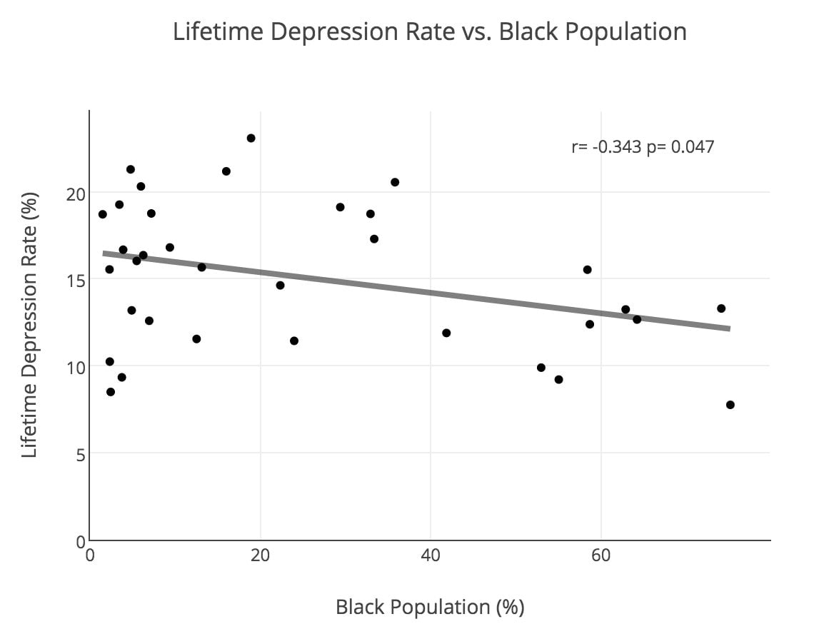 Because the p-value of .047 is less than the significance cutoff of .05, there is a significant relationship between the proportion of black people in a neighborhood and the lifetime depression rate in that neighborhood. Full graph available here.