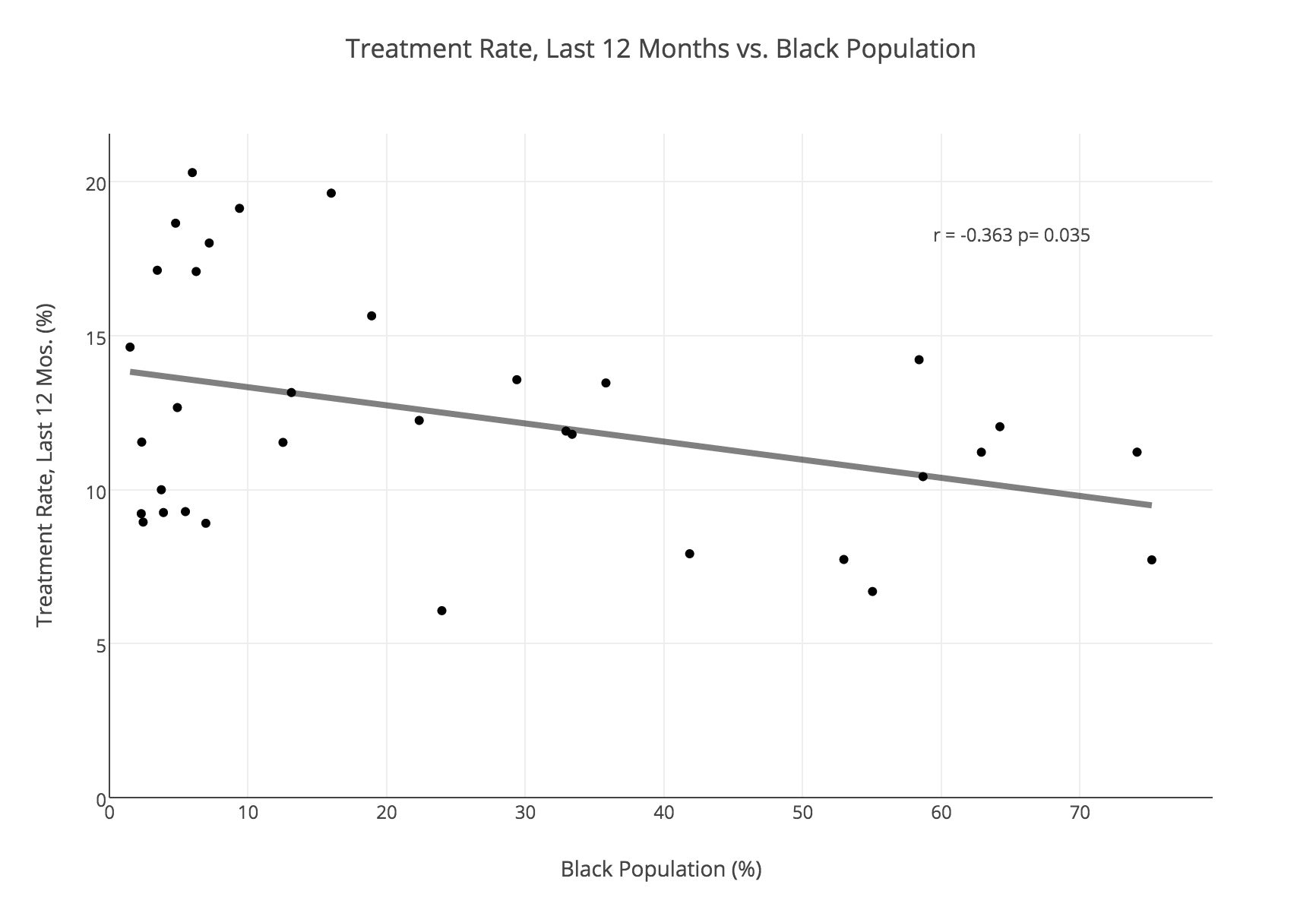 Because the p-value of .035 is less than the significance cutoff of .05, there is a significant relationship between the proportion of black people in a neighborhood and the treatment rate in that neighborhood. Full graph available here.
