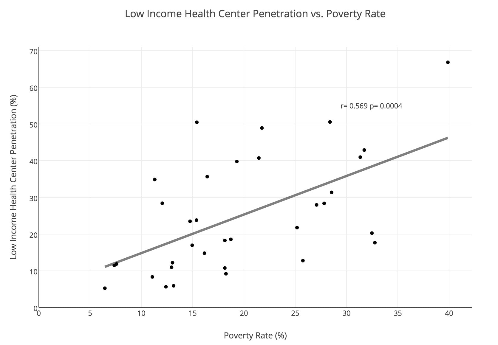 Because the p-value of .065 is greater than the significance cutoff of .05, there is not a significant relationship between the proportion of low income people in a neighborhood and the treatment rate in that neighborhood. However, a p-value of .065 shows that there is a trend between the variables. Full graph available here.