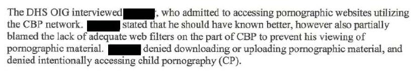 [Name redacted] opined that the CBP IT filter should have been more robust, to prevent him from accessing any of the sites, and that because he accessed some of the sites, he thought that CBP bore some responsibility for not stopping him entirely.