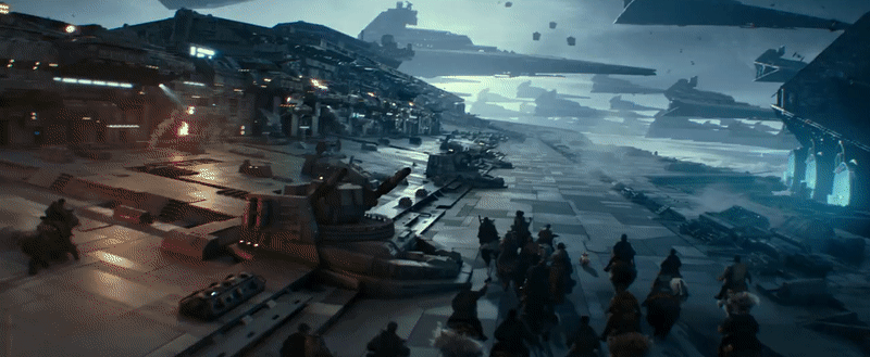 This shot was released ahead of last night’s trailer in a brief TV teaser, and we’ve already gone through a breakdown of some of the ships we can see in the background of this massive gathering which is essentially a greatest hits of Star Wars heroic ship design. Here’s a glorious high-res still of it that you’ll want to make your desktop wallpaper: