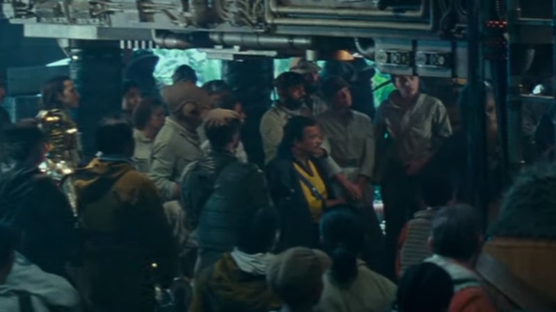 As Finn’s moment concludes, another narrator enters the trailer: Poe Dameron (Oscar Isaac). “We’re not alone,” Poe tells us, as we cut to a snapshot of the Resistance’s new base, filled with plenty of pilots and operatives—there’s a bit of a gap between The Last Jedi’s end and The Rise of Skywalker’s beginning, a gap currently being filled by a swath of books and comics depicting the shattered Resistance reaching out to whatever allies they can.