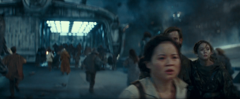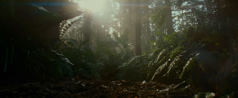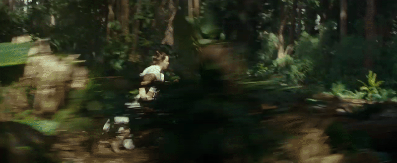 As Rey continues to run, Finn (John Boyega) begins to narrate, ruminating on the power of the Force. “It’s an instinct,” he says, “a feeling.” But as Rey leaps over a ravine, she finds herself making a similar jump in the ruins of a ship—much like the Star Destroyer innards she used to scavenge in Jakku’s graveyards. Given she’s still in her new Rise look, there stands a good chance this is a scene that takes place on whichever planet the waterlogged ruins of the second Death Star are on. But is this moment just a clever cut, or vision of the Force teasing Rey with what’s to come?