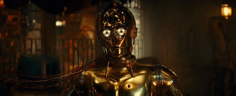 As Rey, Finn, and Poe look on, Poe asks 3PO what exactly he’s staring at. And, out of nowhere, Anthony Daniels delivers the sharpest, most sudden knife to our collective innards.