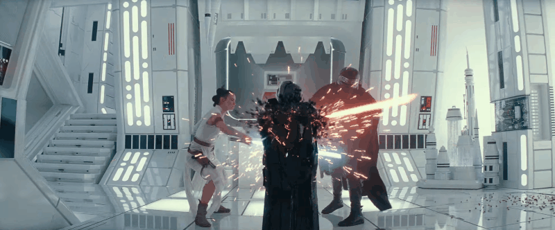 Because we cut right to this shot of Rey backing away from what very much looks like Palpatine’s renewed form. And it’s moving toward her. Once again, the lightning and frozen floor hint that this is happening in the same environment as the previous shot. Is the mechanical frame Kylo is standing in front of in the last shot part of whatever kind of machinery that has resurrected Palpatine? Does he have some kind of mechanized, mobile throne to sustain him? Is he, like his prior apprentice, more machine than man now?