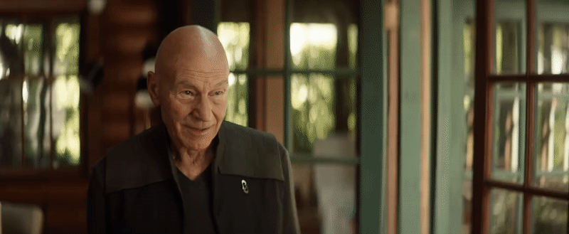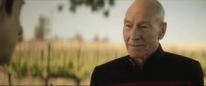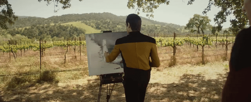 The trailer opens in the familiar vineyards of Chateau Picard in La Barre, which Jean-Luc has now taken over after the death of his brother and nephew in a fire at the estate, something he learned way back in Star Trek: Generations. But something isn’t quite right. We don’t see Jean-Luc here first, but instead, Data (Brent Spiner), wearing his yellow operations uniform from The Next Generation and painting on a canvas. Funny thing for a dead android to be doing, given that Data sacrificed himself in the climax of Star Trek: Nemesis—which Picard is set approximately two decades after.