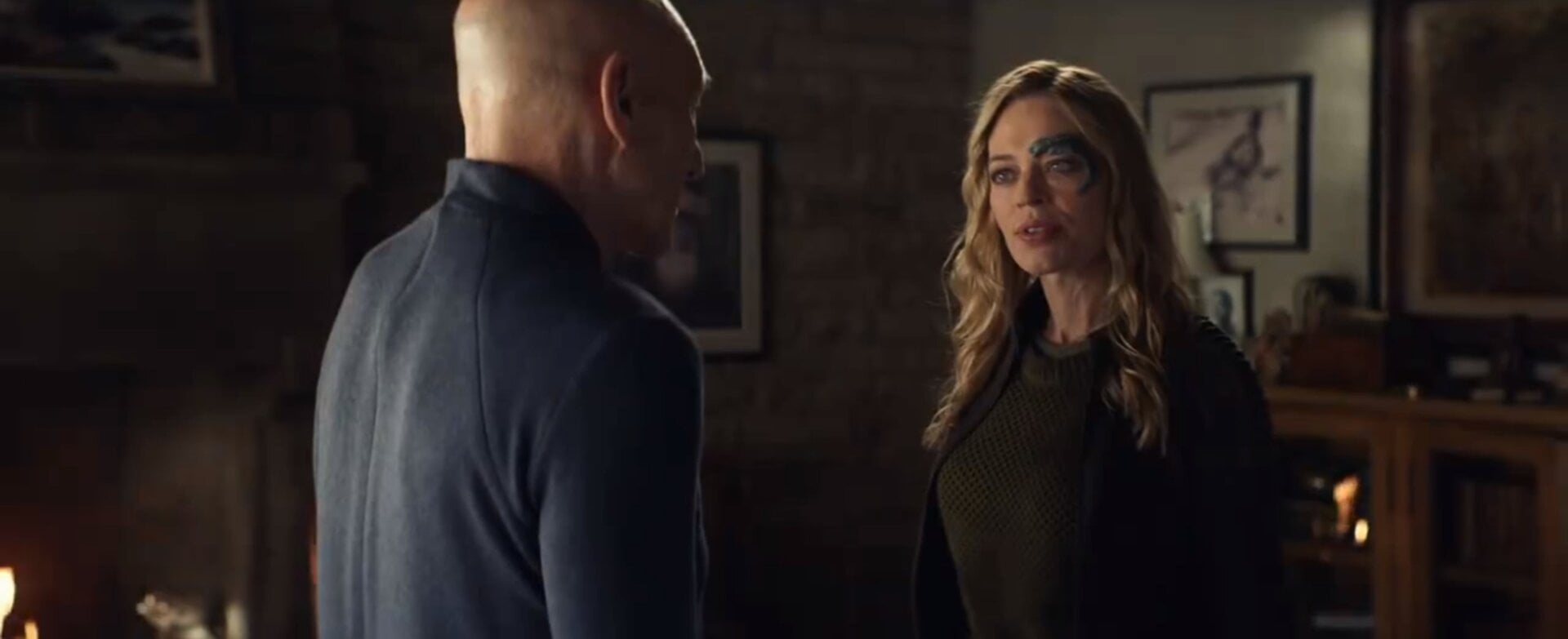 Before we’re left to ponder too much, we rejoin Picard at what appears to be Chateau Picard once more, enjoying a drink with an unfamiliar character after he’s sent packing by Starfleet Command. “I have to help her,” Picard opines, as his unknown guest asks “You really wanna go back out into the cold?”