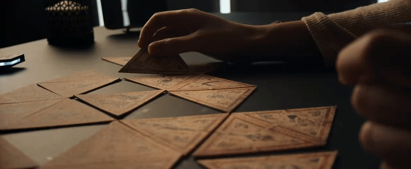 “We all have a story…” Picard’s narrates, as we see a few more intriguing scattered shots—a triangular-card-game being played, Jurati and Rio getting romantic, and those same ships from Picard’s flashbacks, now with blue lighting, assaulting some kind of space station.