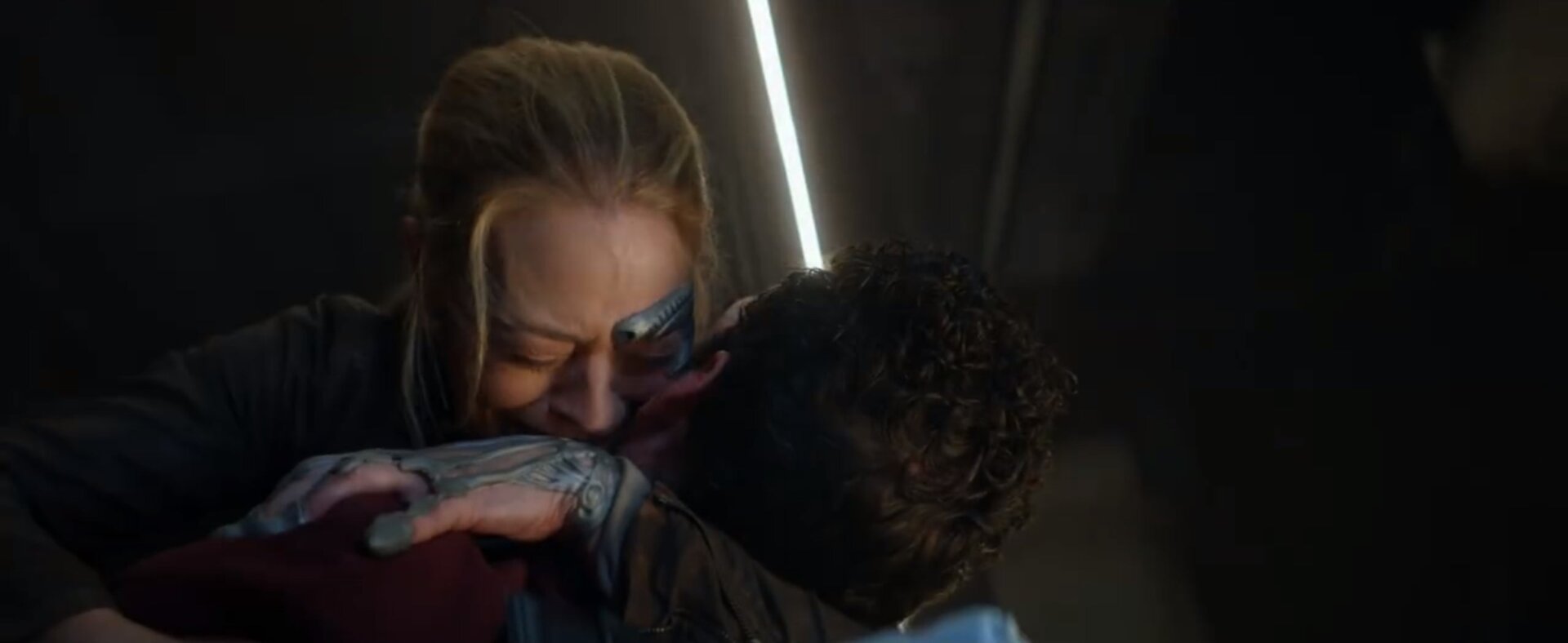 …and it’s none other than Star Trek: Voyager’s very own liberated Borg, Seven of Nine (Jeri Ryan), wailing as she hugs the body of what looks like a Starfleet officer—look at the red shoulders on their uniform. But who is it that Seven is mourning? The hair and the command red has had a lot of people speculating that, somehow, it’s Commander Chakotay, Robert Beltran’s ex-Maquis-turned-first-officer from Voyager, who Seven entered into a…let’s say controversial, out of nowhere romantic relationship with in the final episodes of Voyager’s seventh and last season.