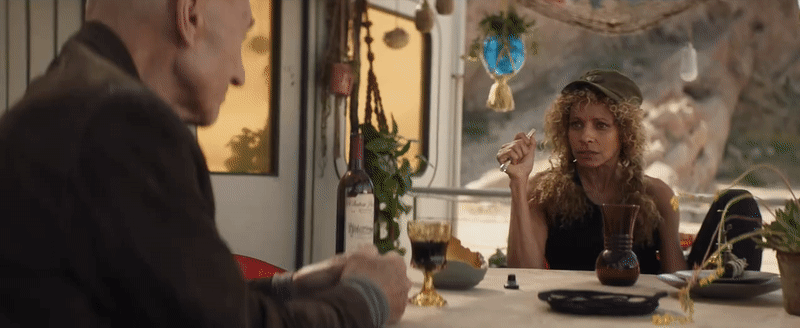 Among the sharply jutting rocks, Picard meets Raffi Musiker (Michelle Hurd). We still don’t know much about Musiker other than that she, like Picard, is ex-Starfleet and has a connection to his past. A sour one, it seems, given that when told by Jean-Luc that he has a plan to help Dahj, Musiker sarcastically mocks him about “another top-secret, unauthorized rescue mission.” So, presumably, she was part of the same rescue operation Picard led that ultimately resulted in his exit from Starfleet. And not just his, but perhaps Musiker’s as well, on more ignoble terms.