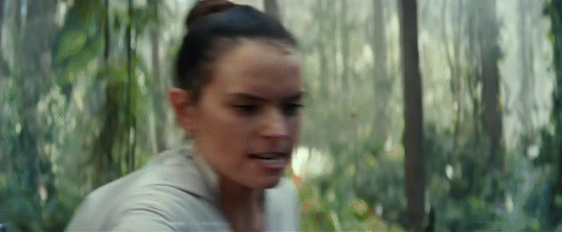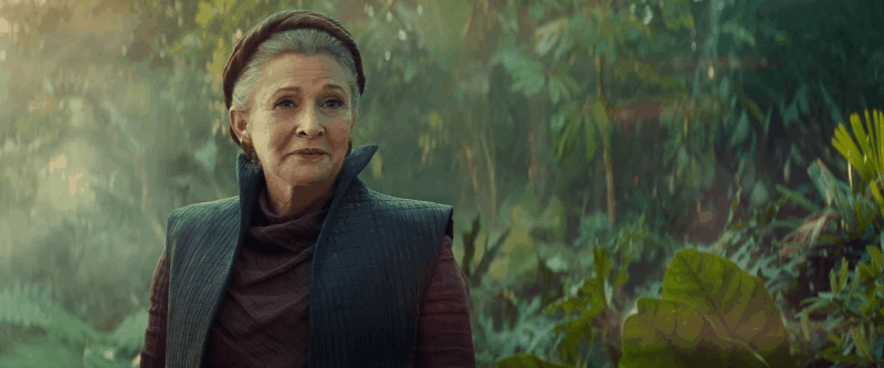 This unknown jungle world is also one we’ve glimpsed a few times and will do so again later in this trailer. We see Leia Organa (the dearly missed Carrie Fisher, included in the movie through scenes originally shot for The Force Awakens) look on at someone with a smile. Given her outfit matches the one we see her embracing Rey in a similar environment in the first trailer, it’s presumably Rey she’s smiling at.