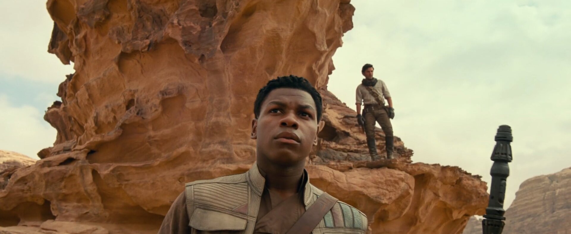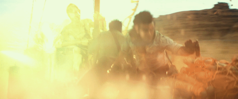 Back on the same desert world we saw Rey and Kylo Ren on, however, we get our first good look at Finn (John Boyega) and Poe (Oscar Isaac). At the panel preceding the release of the trailer, Boyega mentioned that Finn has come into his own sense of identity as a Resistance member in The Rise of Skywalker, and part of that is down to a new outfit he’ll have in the film. Also, note that he’s carrying Rey’s staff for her while she’s off being chased by the Silencer, which is very sweet of him—and a reminder that our disparate heroes will be united in this film after spending much of The Last Jedi apart.