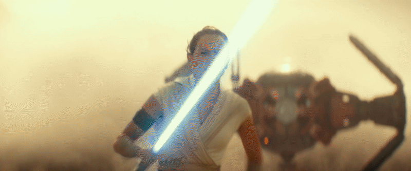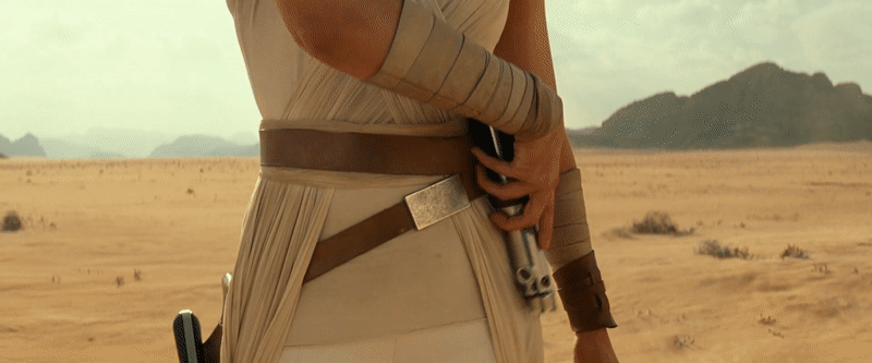 The outfit she’s wearing is new, although was recently seen in a leaked marketing poster for The Rise of Skywalker. It’s an interesting evolutionary blend between the scavenger regalia she wore in The Force Awakens and the Resistance greys she wore in The Last Jedi, but now in all white and with a hood. But the most interesting thing is perhaps not her gear, but the familiar weapon dangling on her waist: the Lightsaber of Anakin and Luke Skywalker.