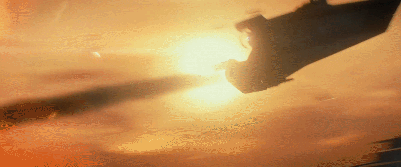 A blink-and-you’ll-miss-it shot of a sunset battle in the lower atmosphere of a planet—it could be this desert world we’ve seen throughout the trailer—shows an unfortunate RZ2 A-Wing getting blown to bits in front of a First Order Star Destroyer.