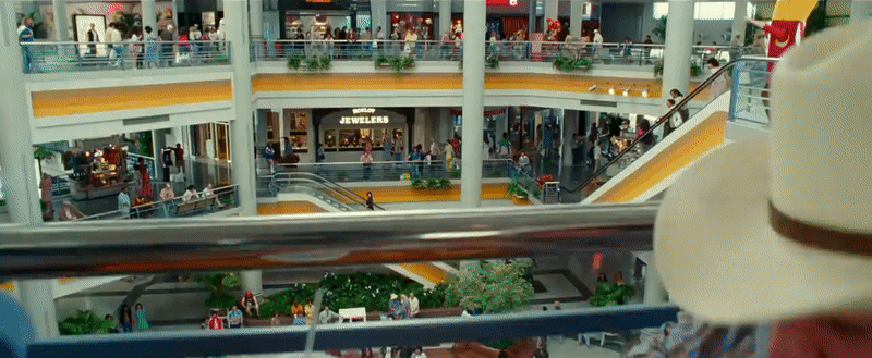 “And why shouldn’t it be? All you need is to want it,” Lord’s ad continues, as we cut between his cheesy self-help infomercial and scenes of chaos at the mall, with distressed crowds fleeing the building, cop cars showing up…and Wonder Woman, entering the fray! So much for staying hidden, Diana.