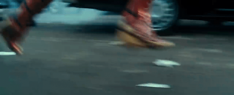A quick cut back to the DC scene from earlier sees Diana, now in her costume, running down the same road we saw soldiers and fleeing civilians on earlier, and we get a very brief flashback to her running on Themiscyra as a child in the process, before, back in 1984, she whips out her lasso and just goes bolting into the sky.