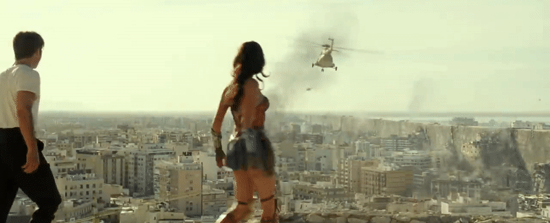 “The world needs you,” Steve says to Diana, as we now cut from fireworks to an unknown city, as the duo chase down a fleeing helicopter. In a similar locale, a massive wall comes crashing down, so wherever this actually is, some bad stuff is going to go down. It’s apparently hot enough for Steve to finally tweak his look a bit and…just take the tracksuit jacket off. Man, that thing is gonna have a stench by the end of this movie, apparently.