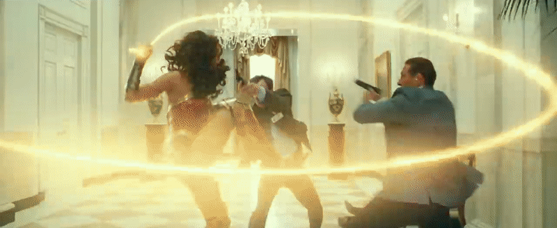 Security guards in a very fancy looking environment open fire on Diana, who is clad in her Wonder Woman gear, shields Steve (still in that damn tracksuit, so it’s hard to say when this takes place exactly) with a flurry of deflections from her bracers. The building doesn’t look like it’s the Capitol, but it’s likely another familiar Washington locale: the White House. Warner’s recent HBO Max reveal event included footage of an action sequence at the office of the President, so that’d match up here. But why are White House security officers attacking Wonder Woman? Are they under Lord’s influence for some reason?