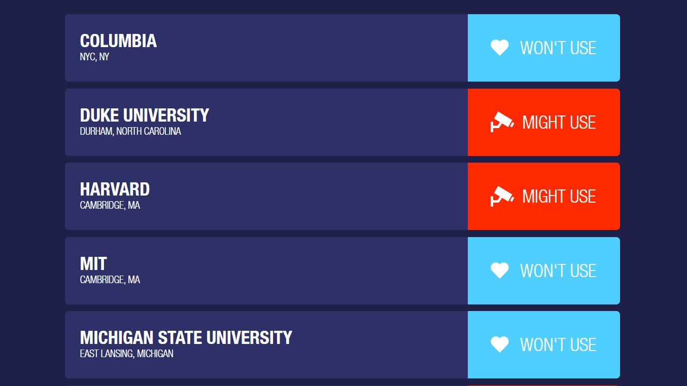 In a statement to Gizmodo, the group said that 45 schools had provided statements indicating they do not use, nor have any plans to use, face recognition. The list includes Boston College, Massachusetts Institute of Technology, Michigan State University, Rice University, New York University, John Hopkins University, and Kent State University, to name a few.