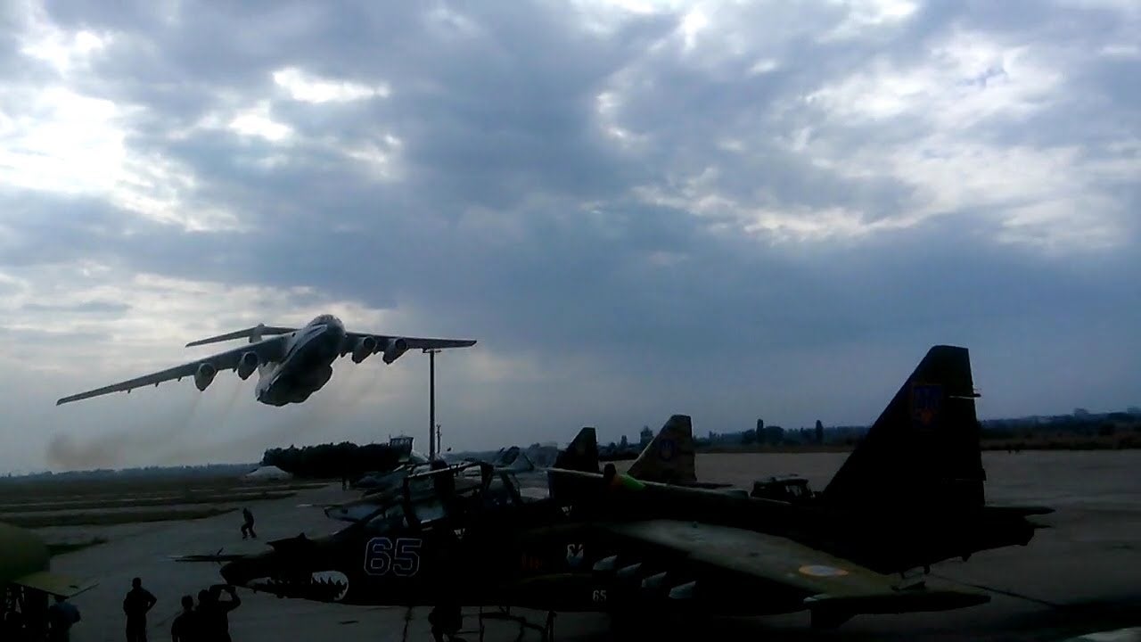 Here’s a role reversal of sorts: an Ilyushin Il-76 cargo plane does a low pass right over some SU-25 fighter jets on a Ukrainian air field. Seeing the big boy plane delicately flying close to the ground over the nimble little planes makes for a pretty hilarious visual.