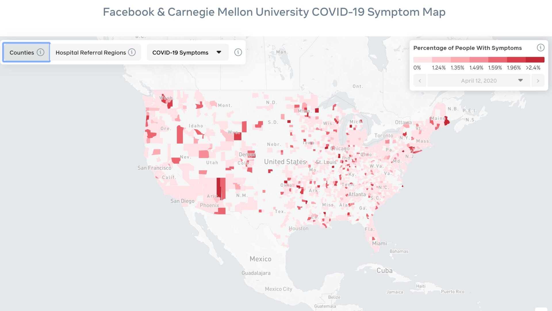 A few weeks ago, Facebook began rolling out an opt-in survey for people in the U.S. to self-report their covid-19 symptoms to help Carnegie Mellon researchers identify infection hotspots. Today, the researchers have launched a website for their findings, while Facebook has turned the aggregated data into an interactive symptom map.