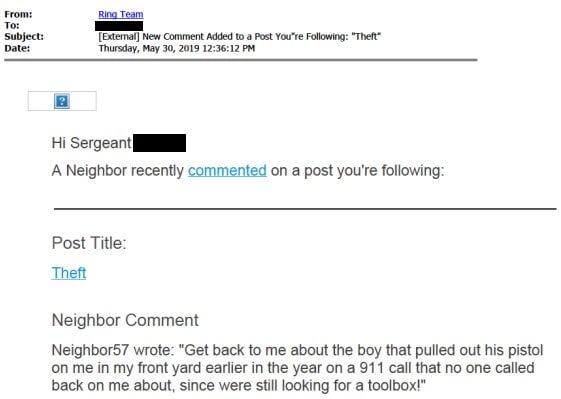 One of Ring’s main selling points to police is that Neighbors can be used for “community building.” Police partnering with Ring are encouraged to conversate with its users, who are encouraged in turn to share “tips” about activity in their neighborhoods. Police can follow posts and receive updates via email as new tips (or complaints) roll in.