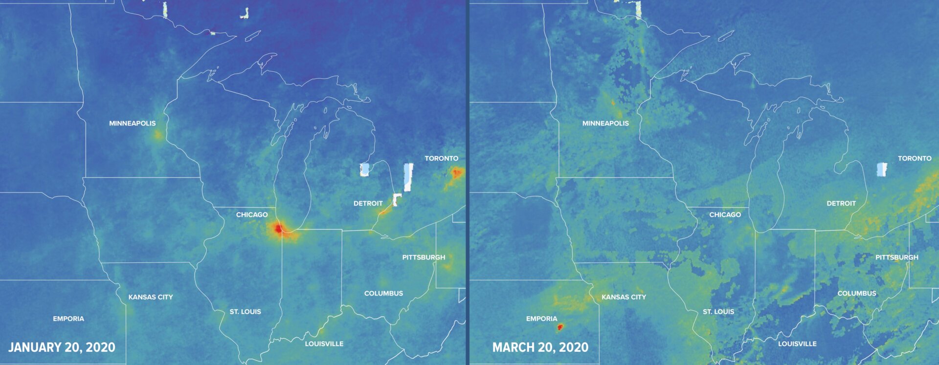 The U.S.-Canadian border, like its southern counterpart, is also closed outside of essential services and trade. The province of Ontario called for a lockdown late last week, and the impacts of these moves also show up on the map. Pollution also gets wiped out in Detroit’s neighbor, Windsor, and Toronto further east.